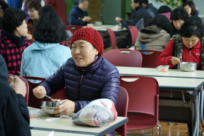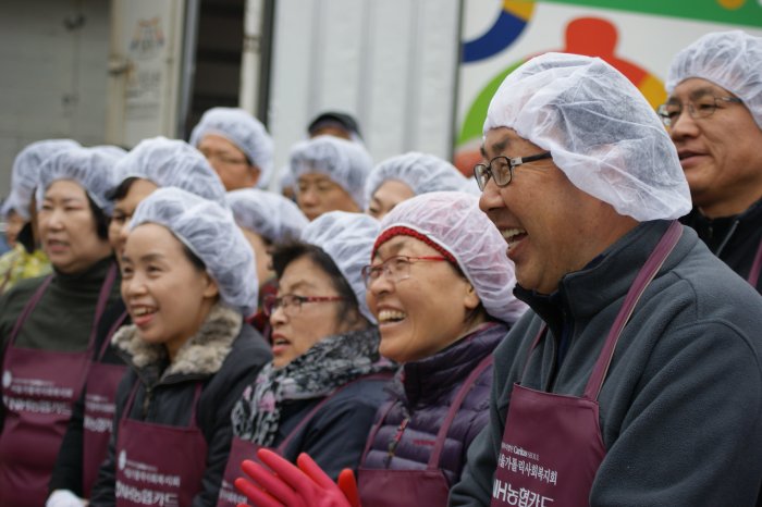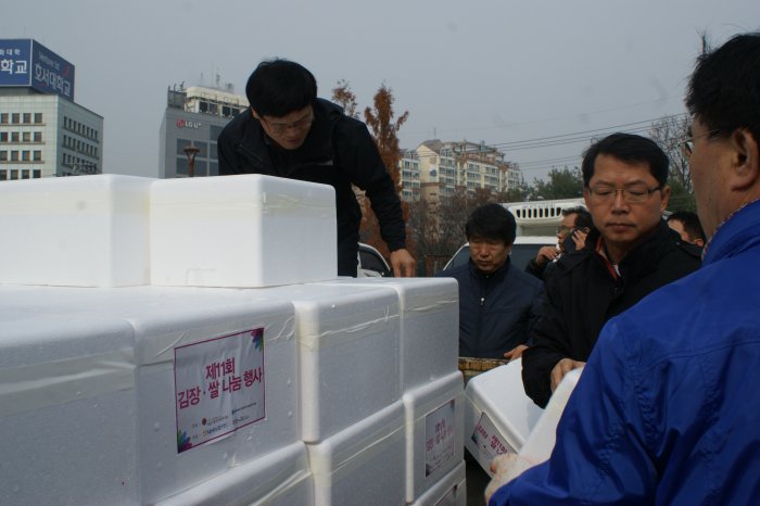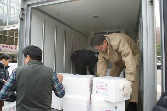 맛있는 설렁탕 식사가 끝나고 행사의 마지막 일정인 지구별 김치 배분이 진행되었습니다. 각 지구에서 온 차량이 순번대로 대기하면 봉사자분들이 차곡차곡 김치박스를 실었습니다. 김치가 가득채워질수록 우리의 정도 이렇게 쌓이는 것이겠지요^^